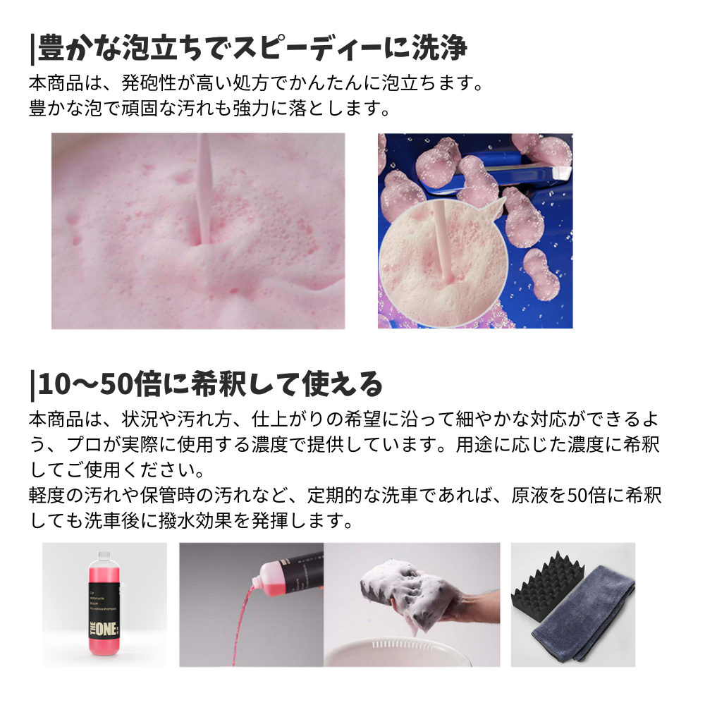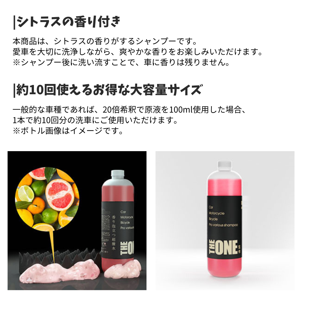 【direct!choice】THE ONE 監修 プロ仕様 カーシャンプー プロ仕様 大容量 特大 1リットル 濃縮 希釈 汚れ防止 ツヤ 撥水 ぴかぴか ピカピカ かんたん 黄砂 花粉 対策 シトラス 大判スポンジ 吹き上げの目が細かいタオル 同梱 自転車 バイ 窓ガラス こだわり メンテナンス 洗車 色付き 泡盛り