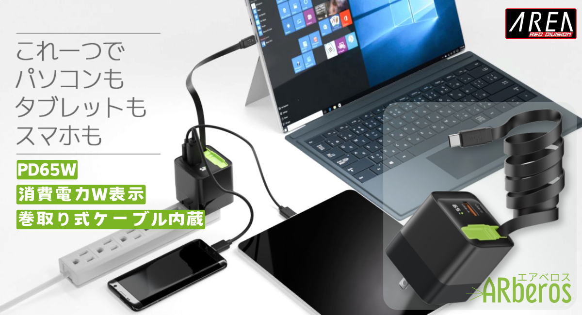 最大3台同時充電対応!見えるW表示と80cmの巻取りケーブル内蔵のPD65W対応AC充電器【ARberos(エアベロス)】を発売!
