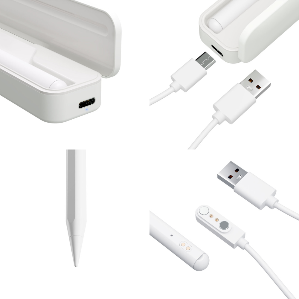 本製品にはペンを収納できて充電できるバッテリー搭載ケースを付属としています。 ペンを収納することで、収納中は自動的にペンを充電いたします。充電忘れや移動中の充電も可能とし次回のご利用時のご利用いただけないを防止します。 また2種類の充電ケーブルを同梱。ペンケースを充電するUSBケーブルとペンに直接充電できる磁石吸着ケーブルを用いて充電することも可能です。