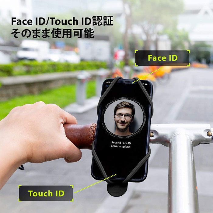 スマホの四隅をバンドが45度で固定します。バンドにはスマホの通話、画面操作、GPSナビ機能、指紋認証(Touch ID)、顔認証(Face ID)を一切邪魔せずに使用可能なホルダーデザイン。