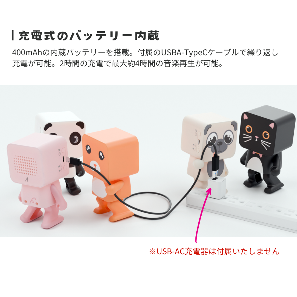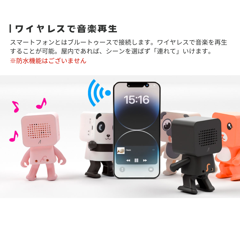 本製品から音楽を流すと、可愛らしい動物たちがダンスを披露する、癒やしのオーディオデバイスです。ダンスのスピードは『停止』『通常スイング』『少し早いスイング』の3段階にお好みに合わせて調整可能。マイクを搭載しているので、スマートフォンの通話にも対応。通話の着信が入ると通話が終了するまでダンスは『おあずけ』。停止してしっかり貴方が話終えるのを待っています。全5種類の個性豊かなデザインをご用意。ふと目に入るユルくて可愛いダンスに癒されながら、音楽時間を楽しもう!