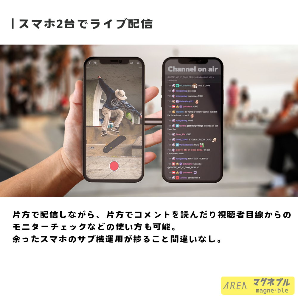 「会社用スマホx個人スマホ」や「配信用スマホxコメント確認用スマホ」、動画の遠近2画面同時撮影などなどアイディア次第で様々な使い方が出来る。