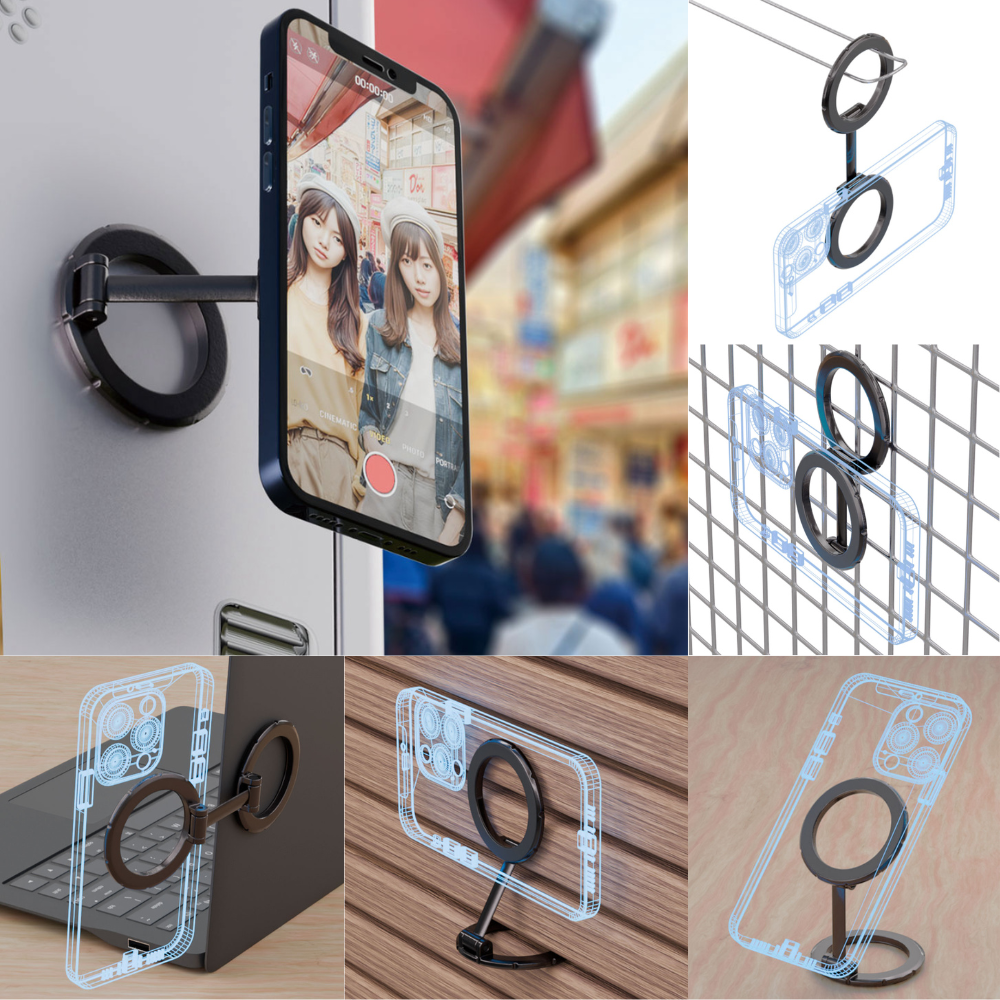 スタンダードなスマホスタンドはもちろん、磁石が付く場所ならどこでも設置可能なので冷蔵庫やキッチン、デスクやラックなど思いついた時と場所に強力マグネットで「バシッ」と貼り付けて使うのも醍醐味。