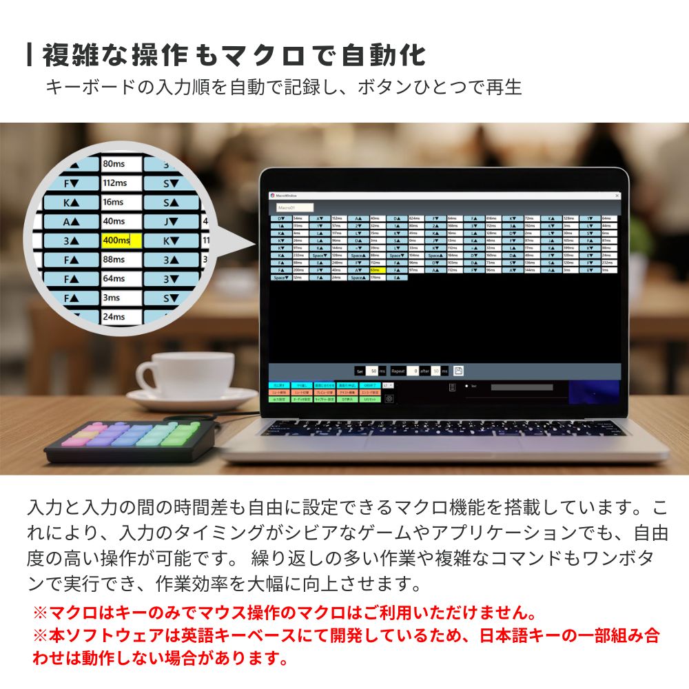 入力と入力の間の時間差も自由に設定できるマクロ機能を搭載しています。これにより、入力のタイミングがシビアなゲームやアプリケーションでも、自由度の高い操作が可能です。 繰り返しの多い作業や複雑なコマンドもワンボタンで実行でき、作業効率を大幅に向上させます。
