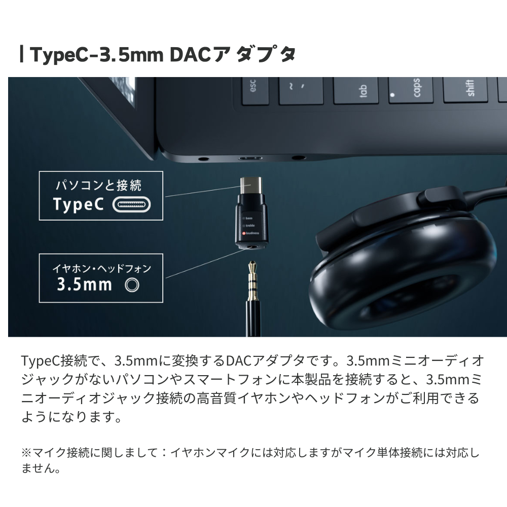 TypeC接続で、3.5mmに変換するDACアダプタです。3.5mmミニオーディオジャックがないパソコンやスマートフォンに本製品を接続すると、3.5mmミニオーディオジャック接続の高音質イヤホンやヘッドフォンがご利用できるようになります。