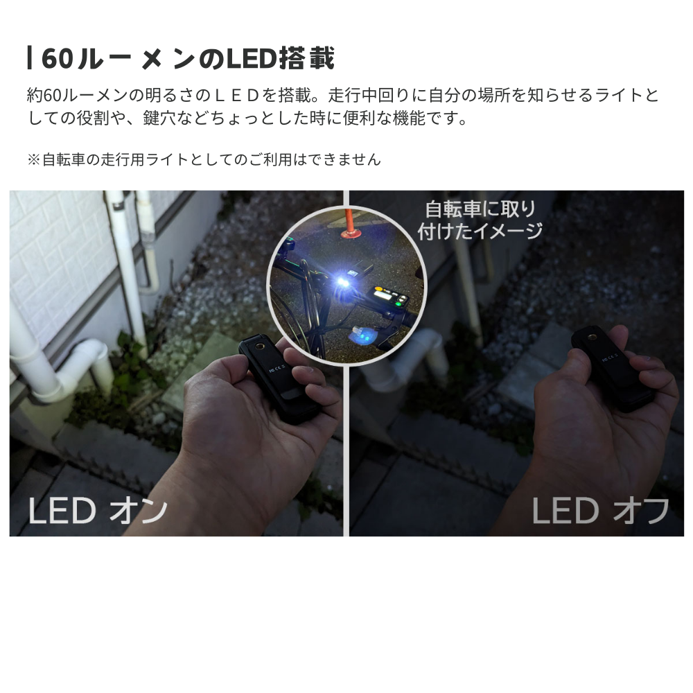 本製品には約60ルーメンの明るさのLEDを搭載。走行中回りに自分の場所を知らせるライトとしての役割や、鍵穴などちょっとした時に便利な機能です。