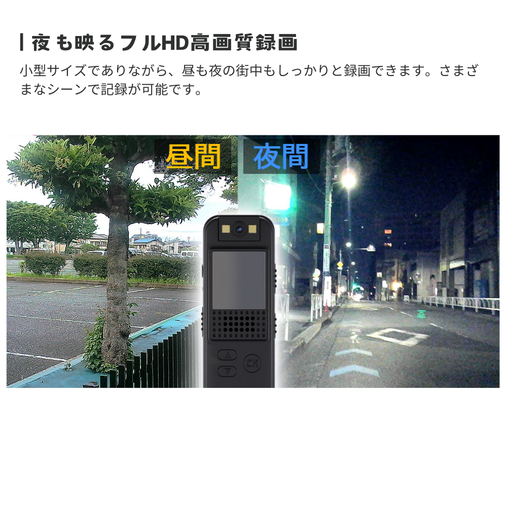 小型サイズでありながら、昼も夜の街中もしっかりと録画できます。さまざまなシーンで記録が可能です。