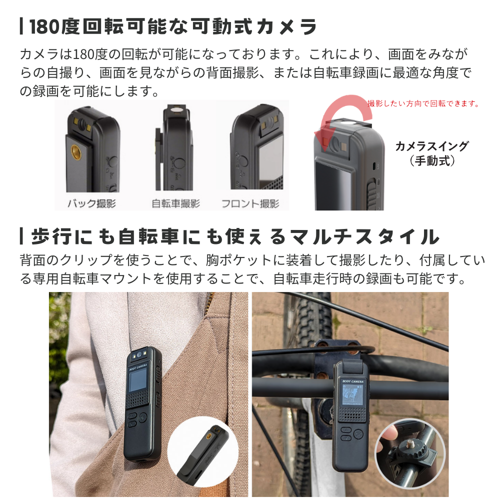 本製品のカメラは180度の回転が可能になっております。これにより、画面をみながらの自撮り、画面を見ながらの背面撮影、または自転車録画に最適な角度での録画を可能にします。