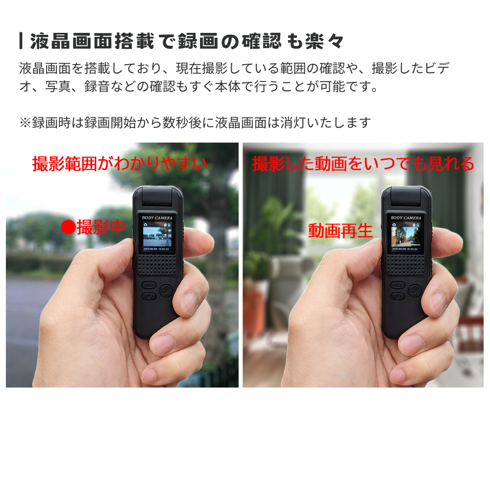 本製品は液晶画面を搭載しており、現在撮影している範囲の確認や、撮影したビデオ、写真、録音などの確認もすぐ本体で行うことが可能です。