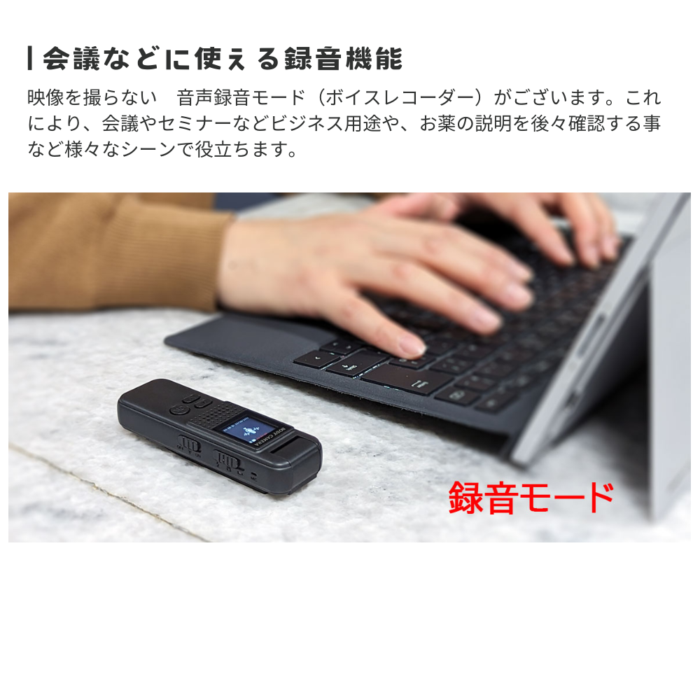 本製品には映像を撮らない 音声録音モード(ボイスレコーダー)がございます。これにより、会議やセミナーなどビジネス用途や、お薬の説明を後々確認する事など 様々なシーンで役立ちます。