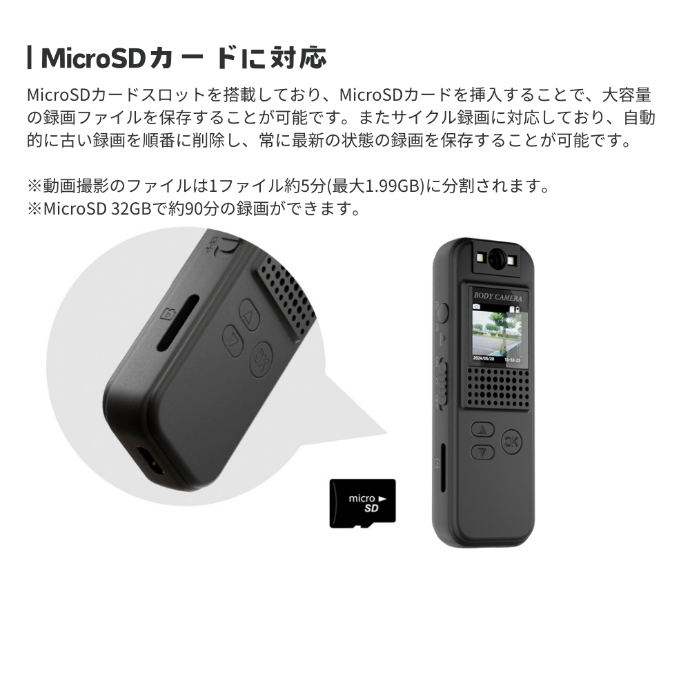 ※MicroSD 32GBで約90分の録画ができます。